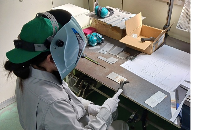 金属を加工したら、次は溶接作業です。まずは練習